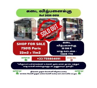 டெலிபோன் * கடை விற்பனைக்கு * PARIS - 75020 Posted on January 28, 2026 in PARIS 75020 WhatsApp Facebook Copy Link Views: 101 Description 📌 கடை அளவு ✅ 25m²✅ வாடகை 1400€ TTC 📌 விற்பனைக்கு ✅ 29500€ HT PARIS - ✅ 75020.✅ Contact WhatsApp only: +33759804091
